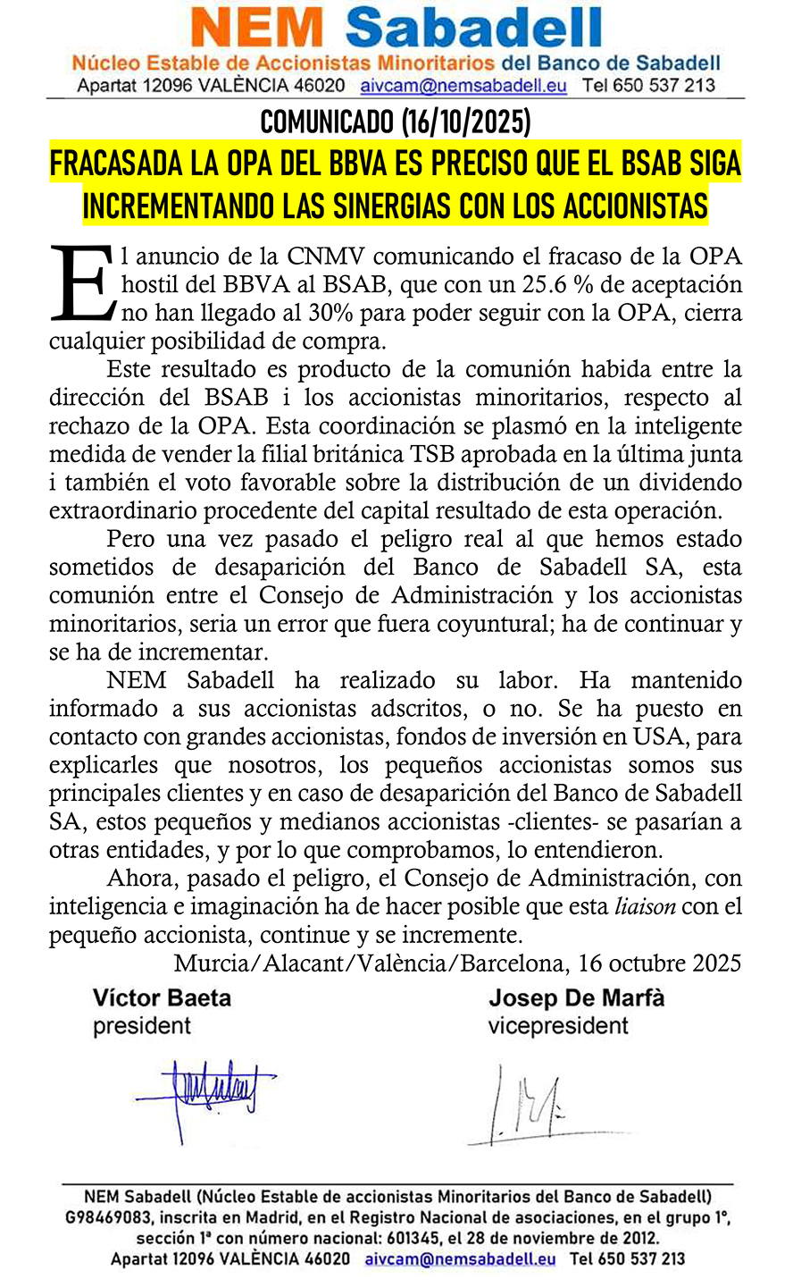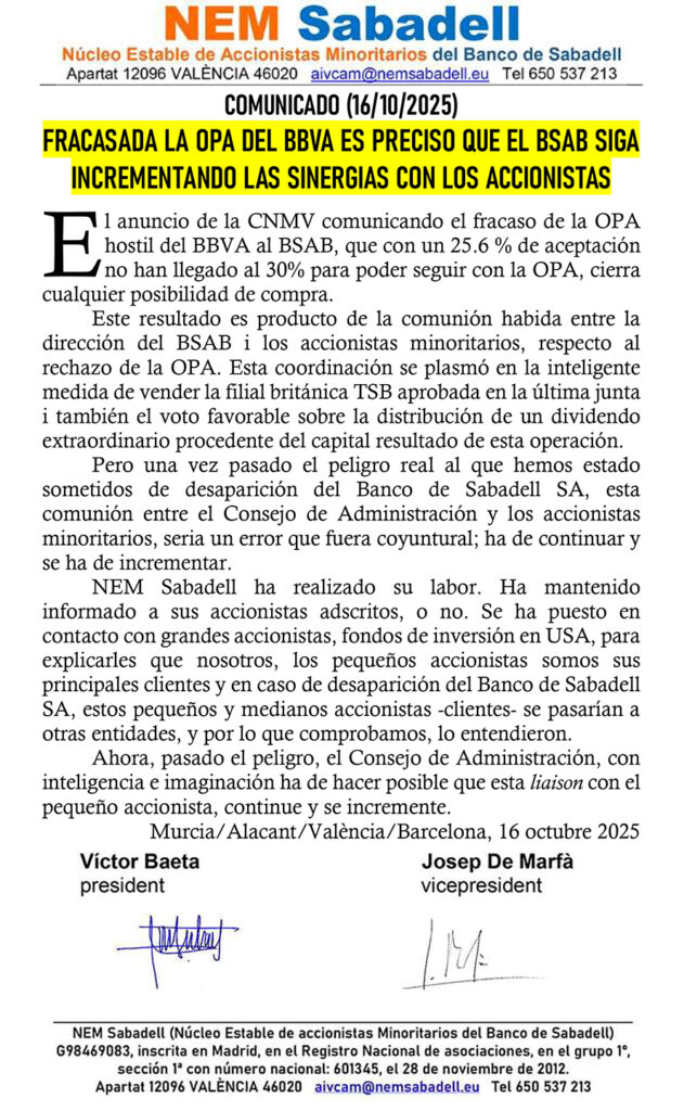 BBVA ha fracasado en su segundo intento de comprar Banco Sabadell. El canje propuesto por el grupo vasco ha resultado suscrito por accionista dueños de apenas un 25,33% del capital de la entidad catalana [valenciana i murciana], por debajo del 30% que se había fijado como umbral irrenunciable y muy lejos del 50% al que había condicionado el éxito de la operación.