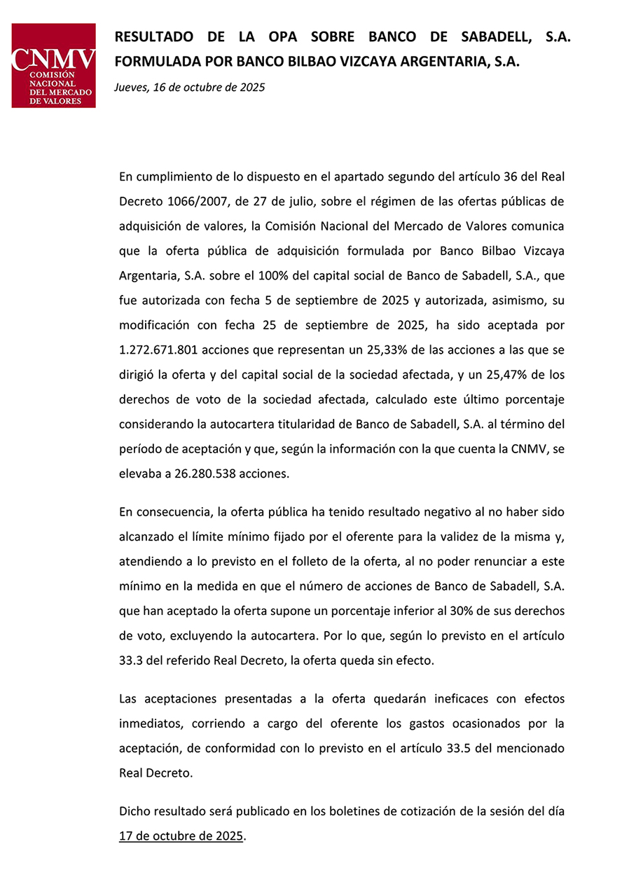 La resolución se ha anticipado en un día al calendario previsto y el banco vasco ha detallado que han aceptado su oferta accionistas propietarios de 1.272.671.801 títulos del Sabadell que representan un 25,33% del capital social y el 25,47% de los derechos de voto de la sociedad afectada -excluida la autocartera-, de acuerdo a la información remitida a la Comisión Nacional del Mercado de Valores (CNMV).