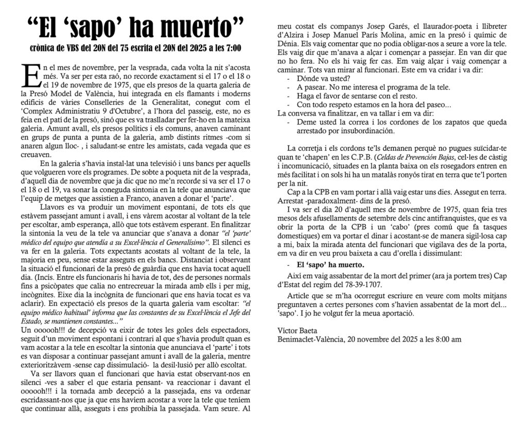 “El ‘sapo’ ha muerto” crònica de VBS del 20N del 75 escrita el 20N del 2025 a les 7:00 https://t.co/78kqJTsZGM