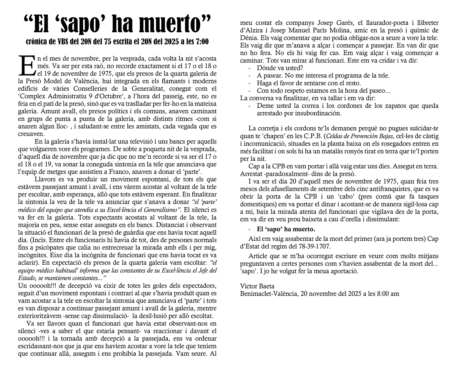 “El ‘sapo’ ha muerto” crònica de VBS del 20N del 75 escrita el 20N del 2025 a les 7:00 https://t.co/78kqJTsZGM