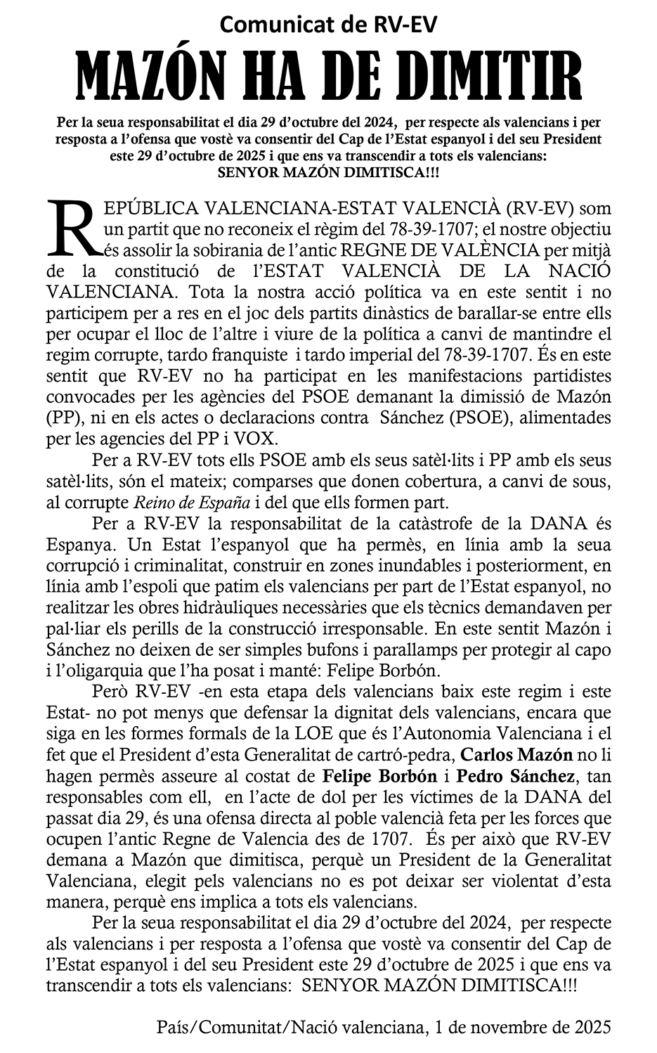 REPÚBLICA VALENCIANA-ESTAT VALENCIÀ (RV-EV) som un partit que no reconeix el règim del 78-39-1707; el nostre objectiu és assolir la sobirania de l’antic REGNE DE VALÈNCIA per mitjà de la constitució de l’ESTAT VALENCIÀ DE LA NACIÓ VALENCIANA. Tota la nostra acció política va en este sentit i no participem per a res en el joc dels partits dinàstics de barallar-se entre ells per ocupar el lloc de l’altre i viure de la política a canvi de mantindre el regim corrupte, tardo franquiste i tardo imperial del 78-39-1707. És en este sentit que RV-EV no ha participat en les manifestacions partidistes convocades per les agències del PSOE demanant la dimissió de Mazón (PP), ni en els actes o declaracions contra Sánchez (PSOE), alimentades per les agencies del PP i VOX.