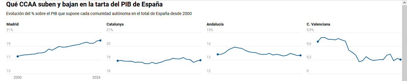 Para que unas regiones tengan una porción mayor de la tarta que es la economía española, el tamaño del resto ha de recortarse miga a miga. Hubo un tímido proceso de convergencia antes de la crisis financiera, pero se evaporó de golpe con el estallido de la burbuja. Desde el 2000, solo cinco de las 17 comunidades y dos ciudades autónomas han ganado peso en el total. Lo que implica que catorce se han descolgado por el camino.
