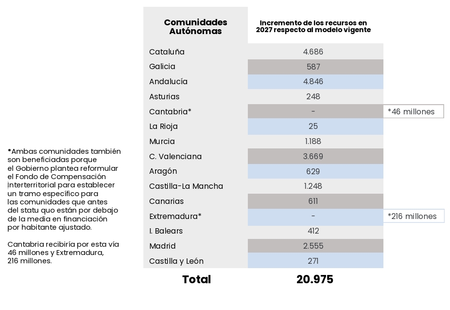 También parece evidente, que, además de a las cuatro CCAA peor financiadas –Comunitat Valenciana, Región de Murcia, Andalucía y Castilla-La Mancha–, el nuevo SFA beneficia de manera notable a Cataluña, que en el actual SFA no está infrafinanciada sino que se sitúa en la media de financiación por habitante ajustado.